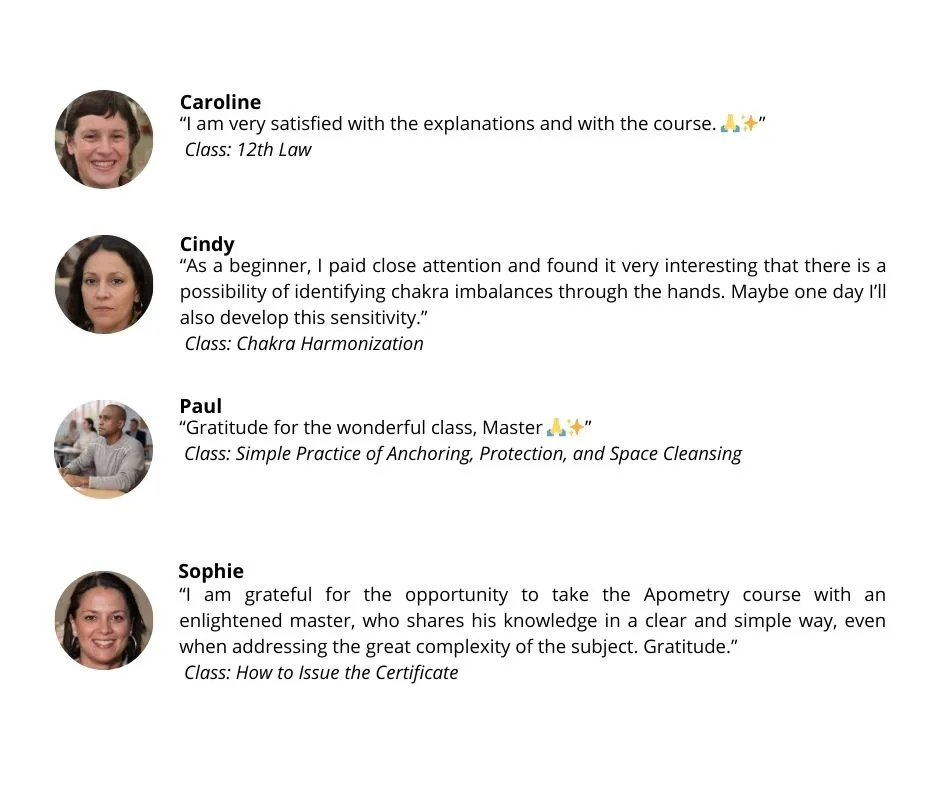 Throughout the following lessons, participants will explore each of the laws individually, gaining insight into their essence, application, and practical implications within Apometry. From the first to the thirteenth law, students will be led on a path of learning designed to provide a deep and comprehensive understanding of these fundamental principles.